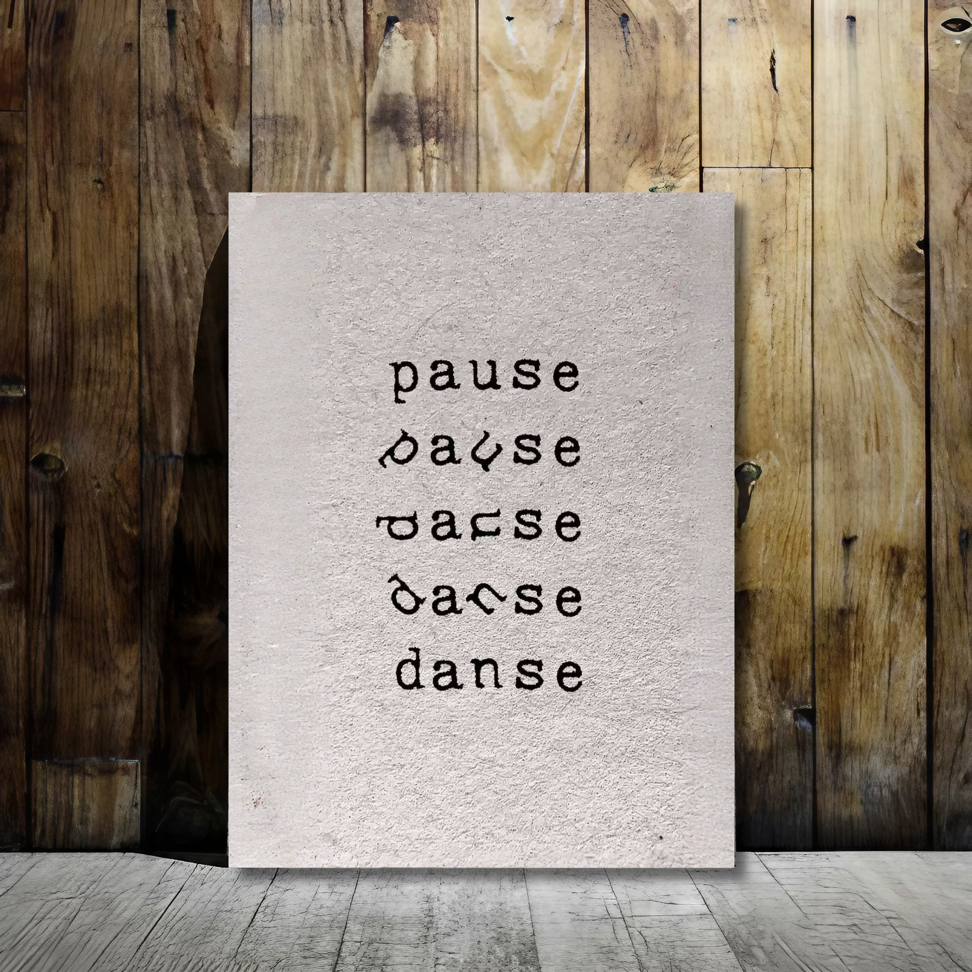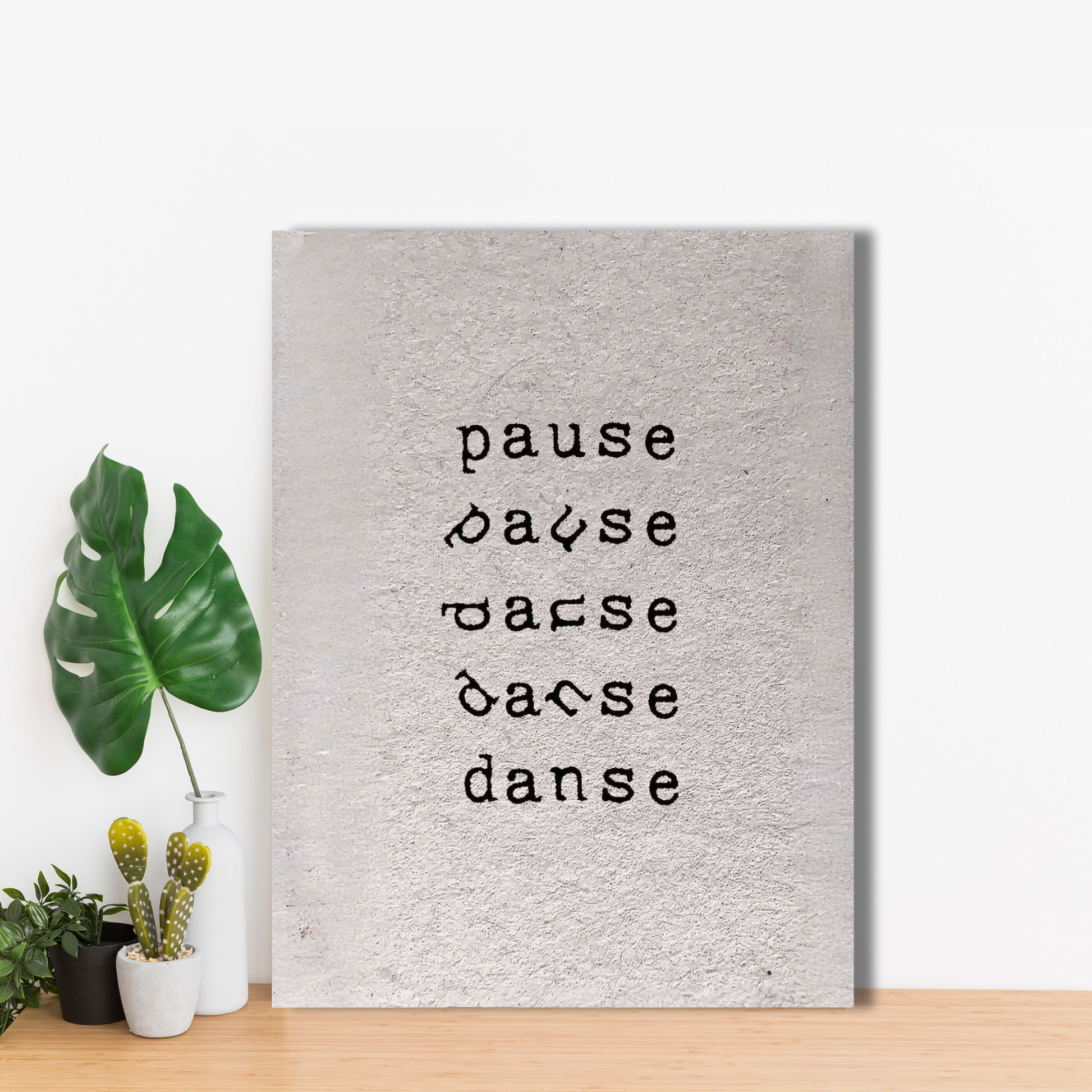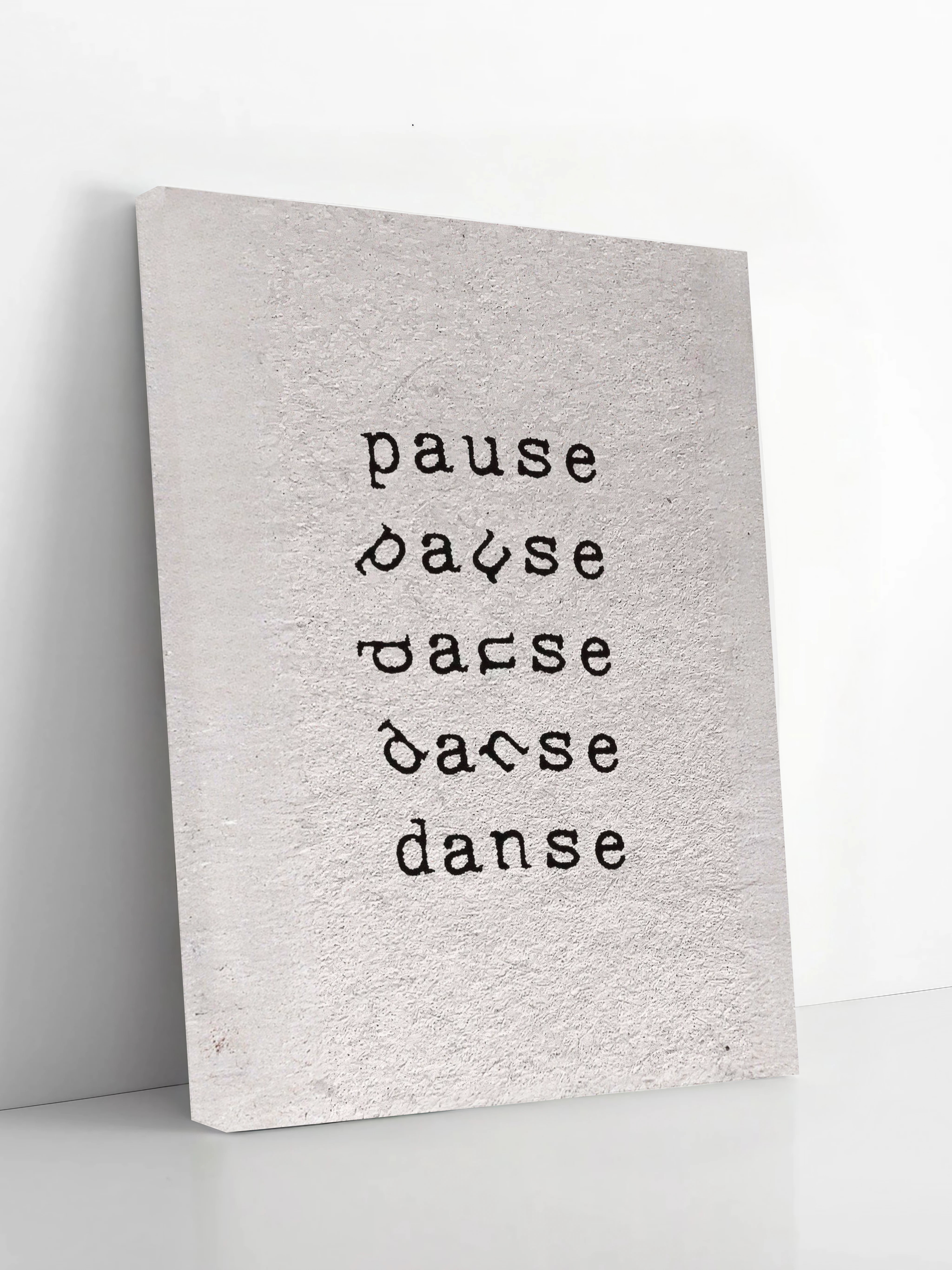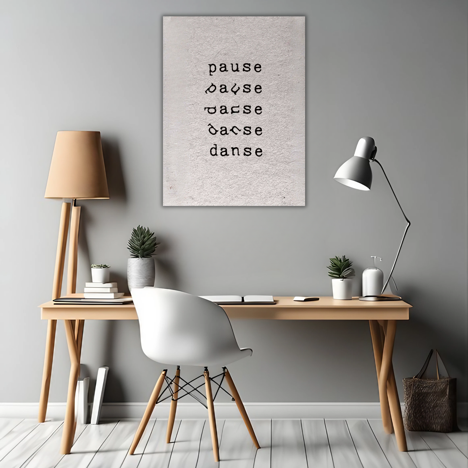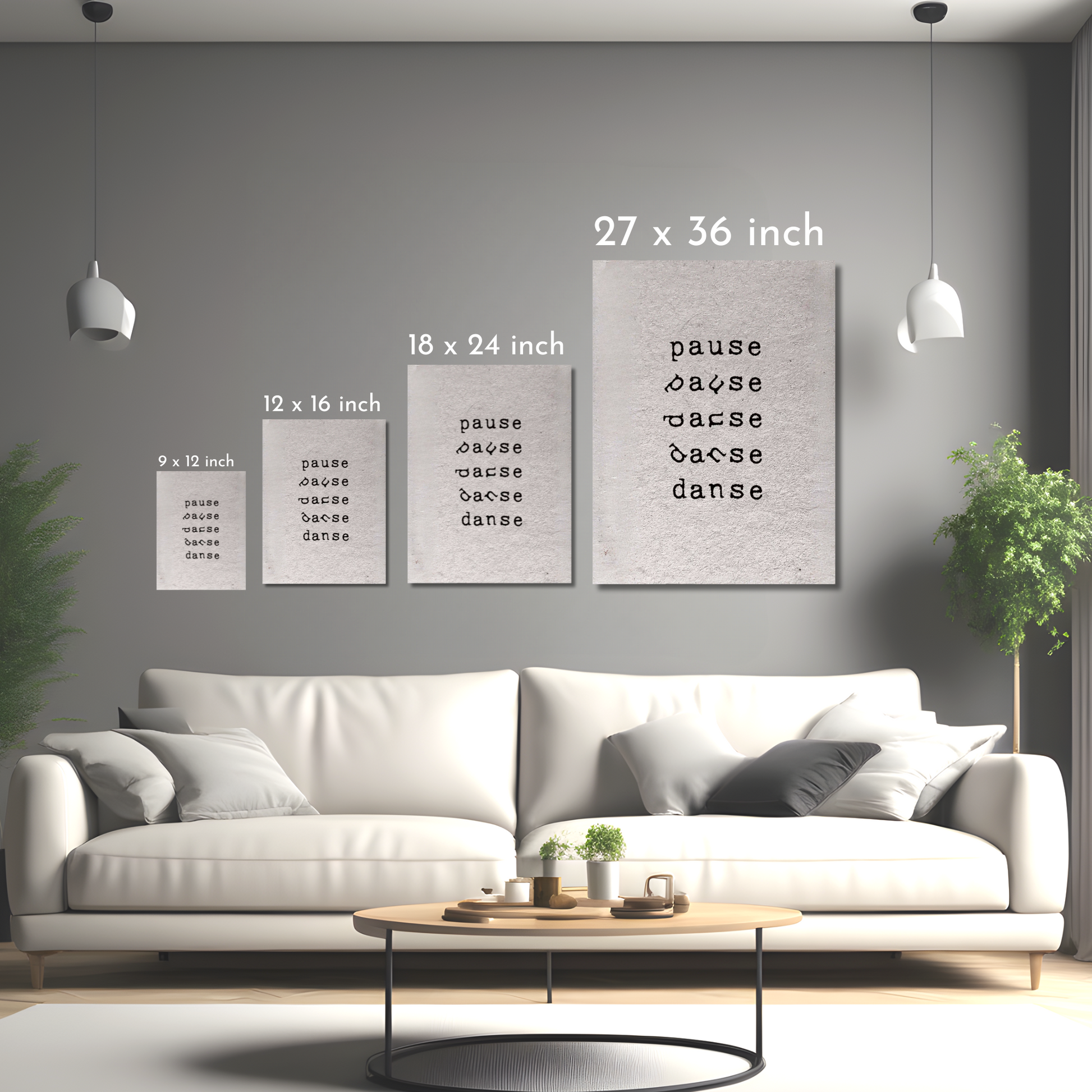 Pause to Dance – This minimalist artwork uses simple typography to convey a powerful message: transforming moments of stillness into movement. As the word "pause" gradually morphs into "dance," it serves as a reminder to find joy in life’s pauses. Perfect for those who appreciate subtle, thought-provoking decor that encourages reflection and positivity.