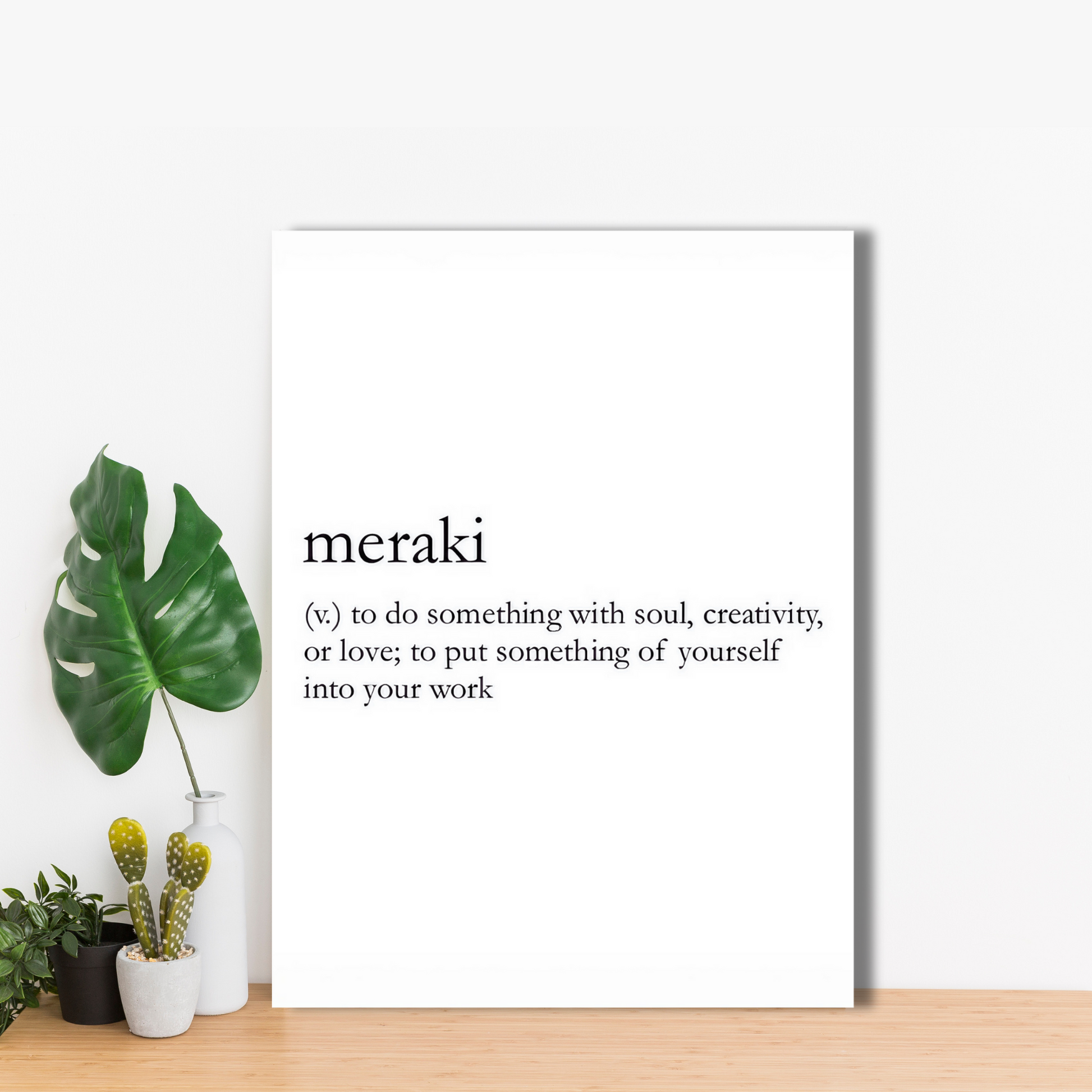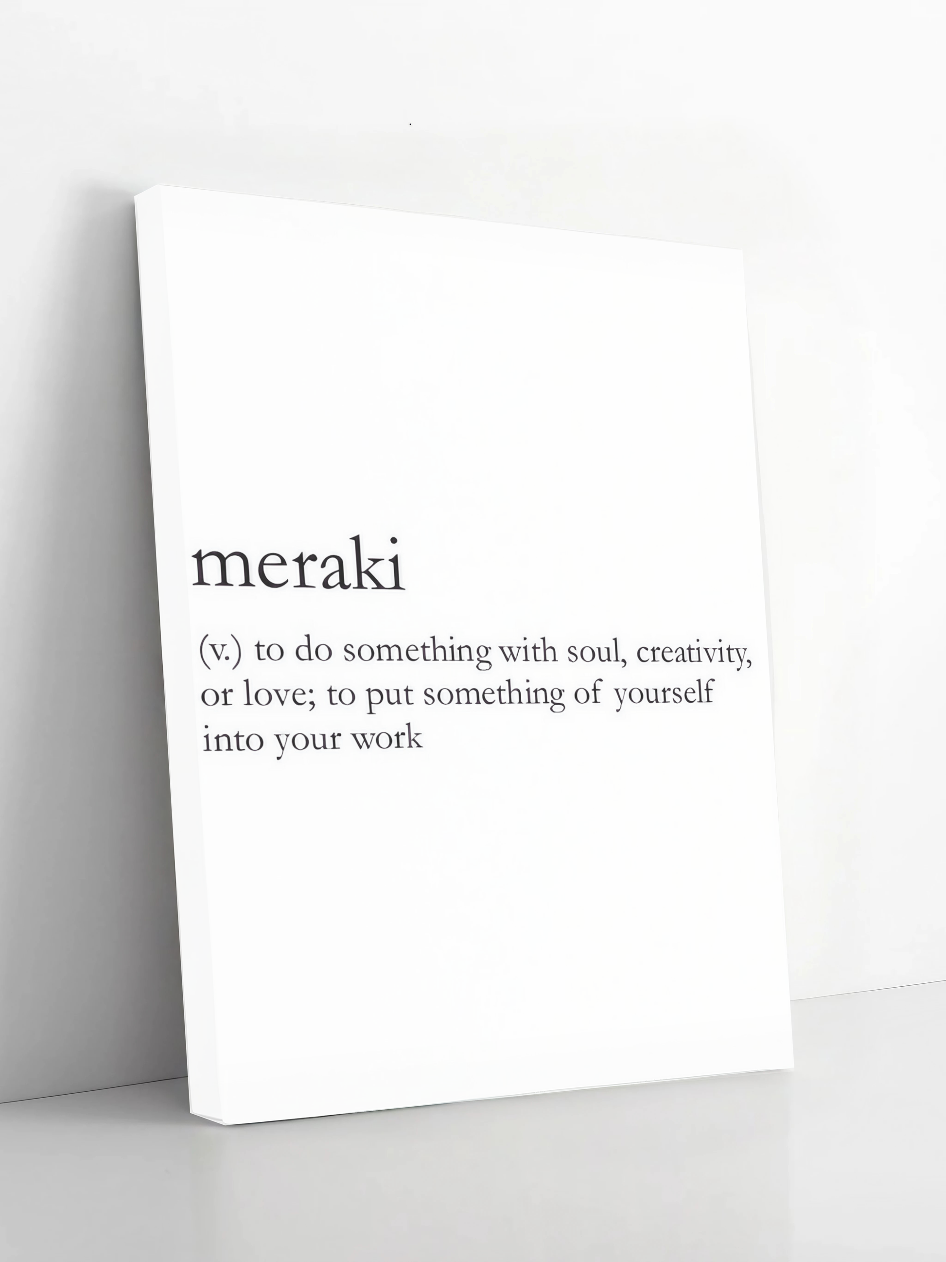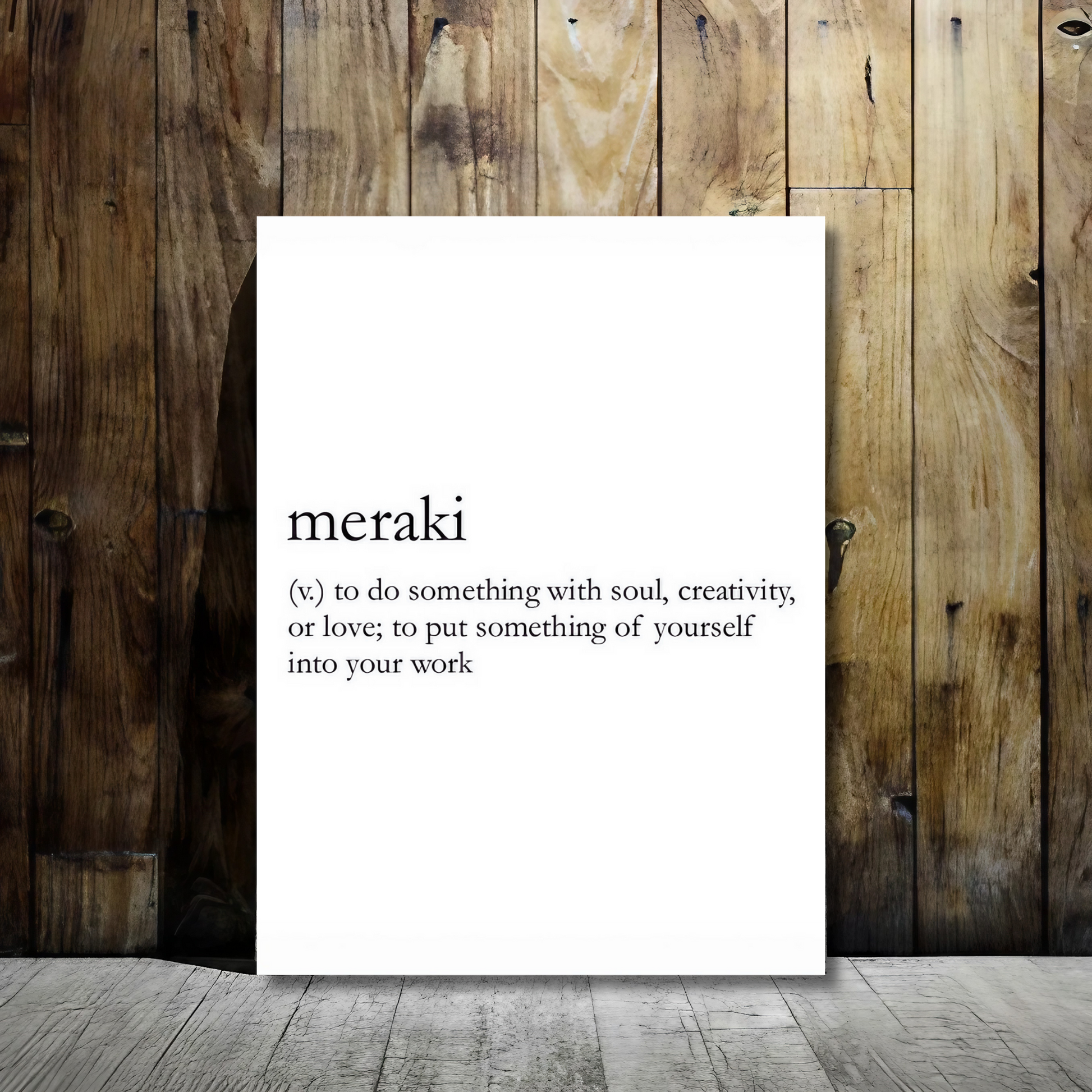 Meraki – Defined as "to do something with soul, creativity, or love; to put something of yourself into your work," this minimalist artwork captures the essence of passion and dedication. Perfect for artists, creators, and dreamers, this piece is a beautiful reminder to infuse personal energy and love into everything you do.